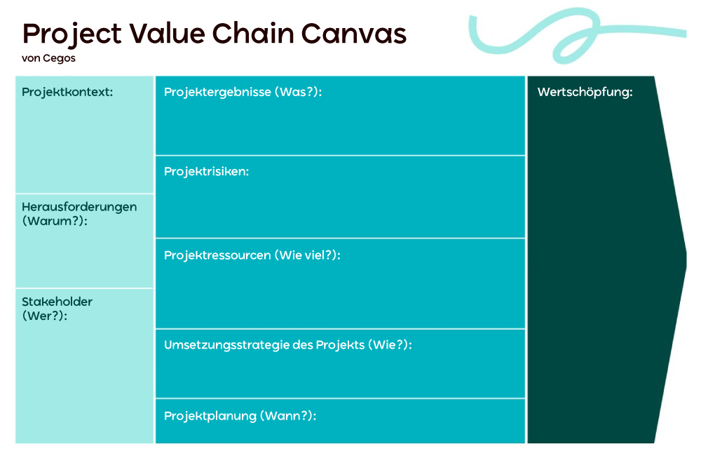 Die folgenden Fragen helfen Ihnen dabei, die einzelnen Bereiche des Project Value Chain Canvas gemeinsam mit den relevanten Stakeholdern auszufüllen.